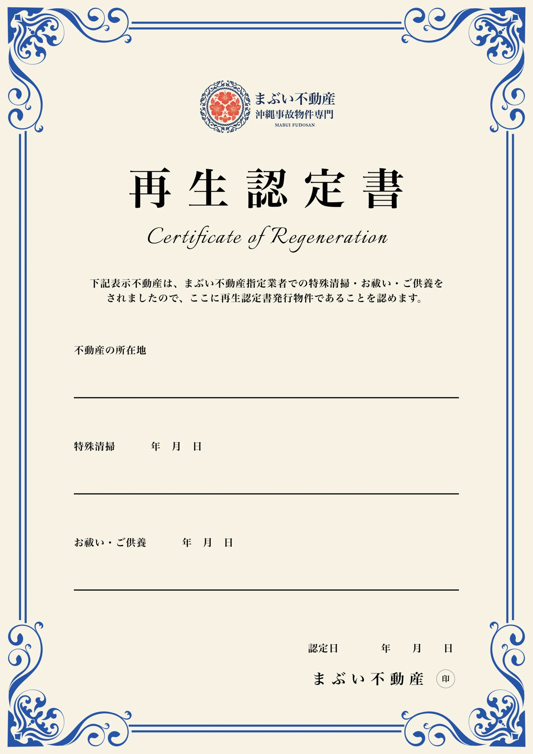 『再生認定書』は、事故物件に対し、当サービスの技術力で徹底した特殊清掃を施したり、お寺や神社で丁寧なご供養・お祓いを行い、その場所に宿る「まぶい(魂)」を整えたことを証明するために発行しています。